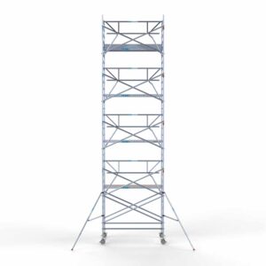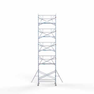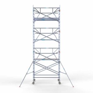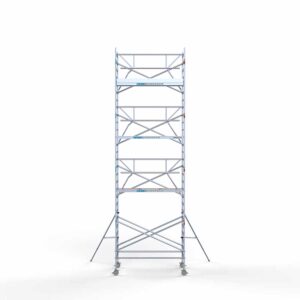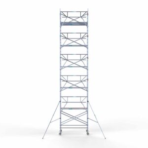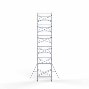 5) Rolsteiger Euroscaffold met enkele Voorloopleuning 1.35 x 2.50 x 8.2 meter werkhoogte tegen de gevel