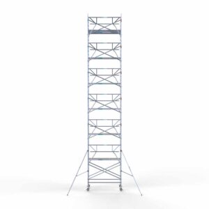 9.0) Rolsteiger Euroscaffold met enkele Voorloopleuning 1.35 x 2.50 x 12.2 meter werkhoogte tegen de gevel
