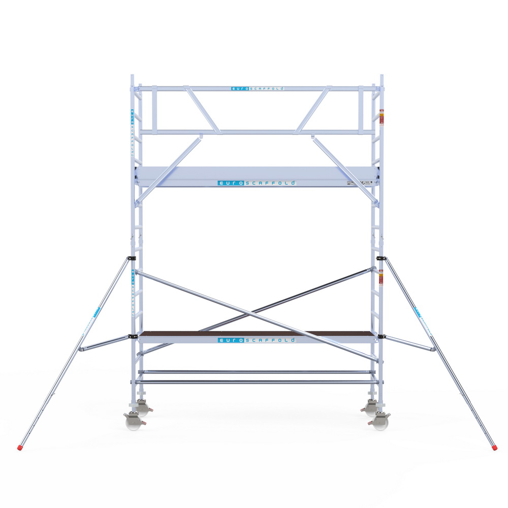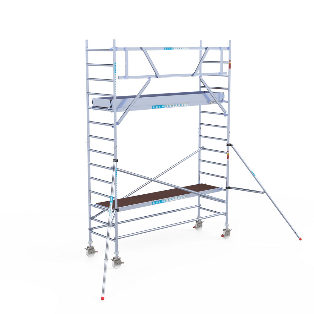 Professionele rolsteiger met een breedtemaat van 90 cm en vloermaat van 305 cm. De maximale werkhoogte van de rolsteiger is 5,2 meter. Het grote voordeel bij deze 90cm rolsteiger is dat de diagonaal schoren langs het platform komen te liggen, hierdoor kan het platform op elke gewenste hoogte neergelegd worden.